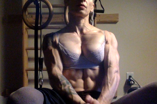 I have not wrestled with her, it is not my kink, but she did once put me in a sleeper hold and knocked me out safely. That was something we did ‘on the side’ before a session just because I was curious what it felt like. I must say, her strong jacked arm around my neck while her Belgium accent whispered in my ear was very hot to me. I was totally overpowered and helpless yet could feel her sexy hard body pressing against me. I do sort of get the wrestling thing after that. 🙂 She used to wear a lot of latex in our play, but more recently I’ve asked her to wear less so that I can just look at her sculpted muscles as we play, she is very willing to find ways to meet your fantasy needs if you just ask nicely.