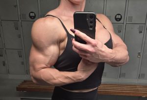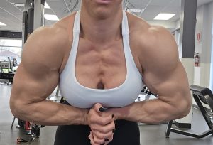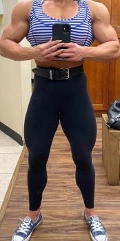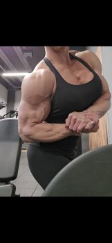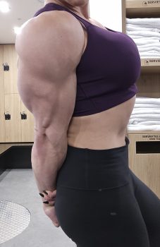 Like I mentioned before she’s in great shape, her biceps are well defined, defined forearms with visible veins, she’s carrying quite a bit of mass right now, delts, biceps, traps, triceps, lats, calves, quads, glutes and pecs.