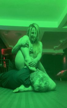 Dominant Force: I first stepped onto the session wrestling scene in 2014 as a blue belt, never having heard of session wrestling before. It was all pretty underground and hush hush back then, but I’m a Londoner, rough and ready to go any time…. plus my mate, Trinity, said “Trouble, use your gym nickname, and just fuck ’em up!”. I remember my first session with a huge, mouthy guy. He is still as mouthy to this day, the only way I can shut him up is to pin him and stick my cute feet where he can see them. I had the time of my life getting my feet worshipped, oil wrestling, lift and carry, ball busting and more!